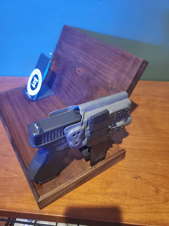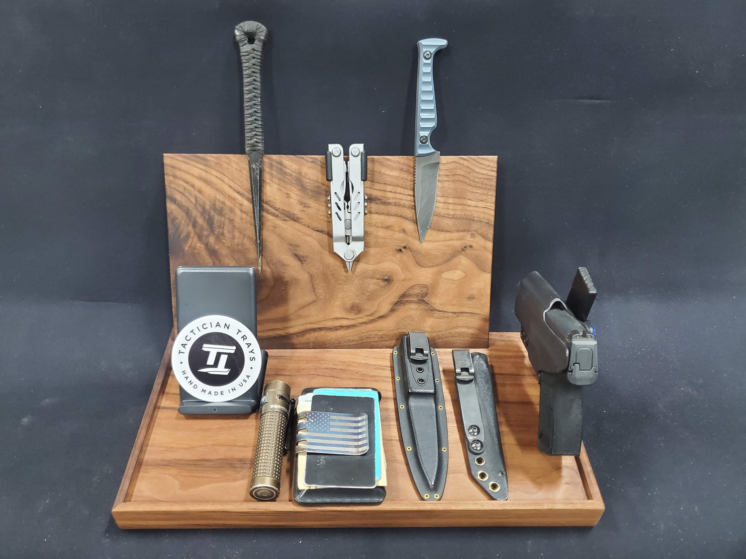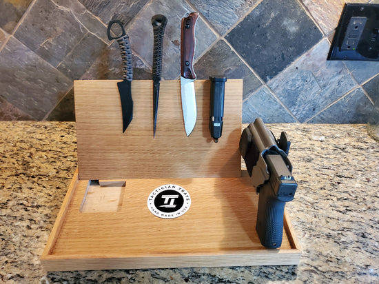 These trays have been designed with safety and convenience in mind. The holster bar allows you to store your firearm safely in the holster so it never has the trigger exposed. This innovative design makes it easy to go straight from your belt to the holster bar with ease. The back wall is fully magnetic to store all of your EDC gear and the phone charger is wireless for an all in one charger for phone, watch and earbuds. Tactician Trays are built to order and have a lead time of about 5-8 weeks.
